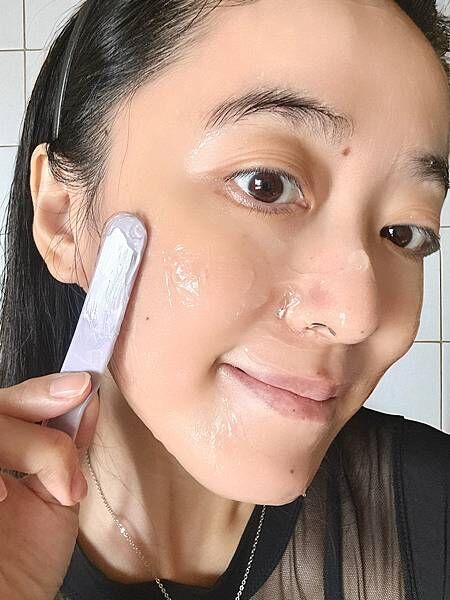 它的質地冰涼,敷上去那種悶熱感會慢慢舒緩下來,會感覺肌膚被溫柔安撫。裡面有乳香植萃跟紫晶水合精華,敷完後整張臉看起來比較平和、不那麼紅。