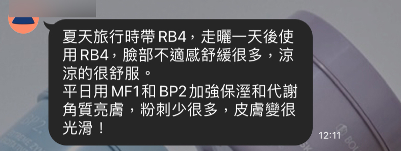刮完之後比較敏感的皮膚有點紅紅的是正常的,可以用化妝棉沾上「BMH超能益膚水」濕敷個3分鐘左右、鎮靜舒緩肌膚,之後再以益膚水輕拍全臉,並擦上「微脂囊益膚保濕精華乳」(益膚乳)做收尾。