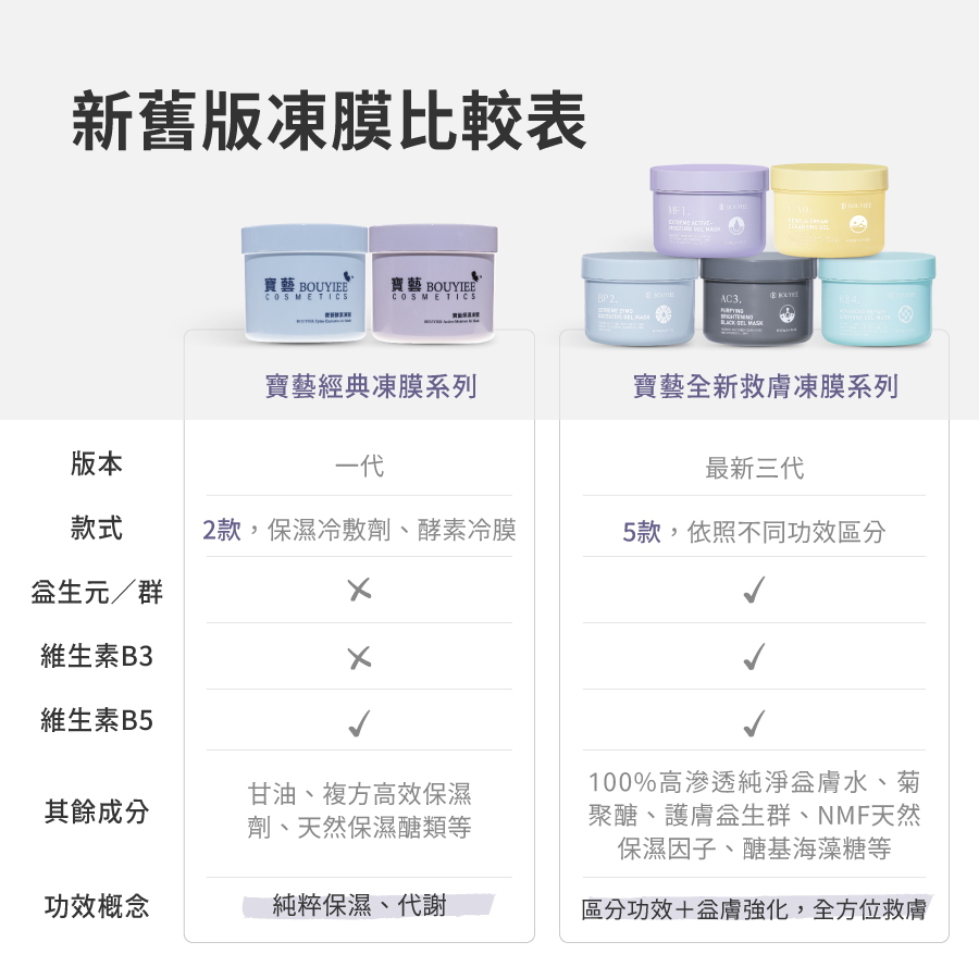 舊款550g的凍膜(BONANZA寶藝 保濕冷敷劑550g、BONANZA寶藝 酵素冷膜550g)是第一代基礎凍膜,「BOUYIEE寶藝全新系列250g」都是第三代的新款凍膜: