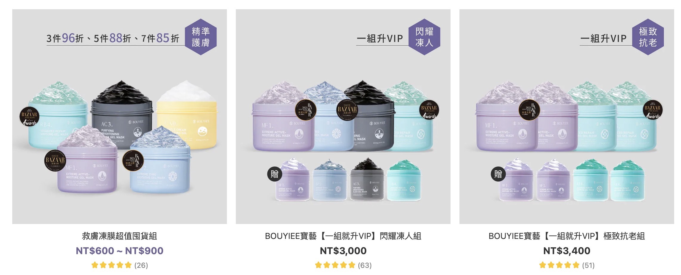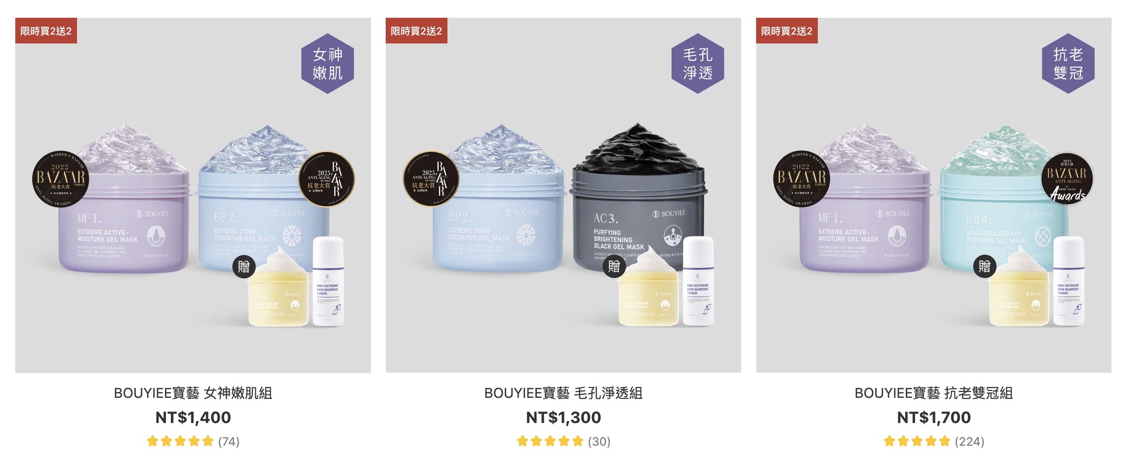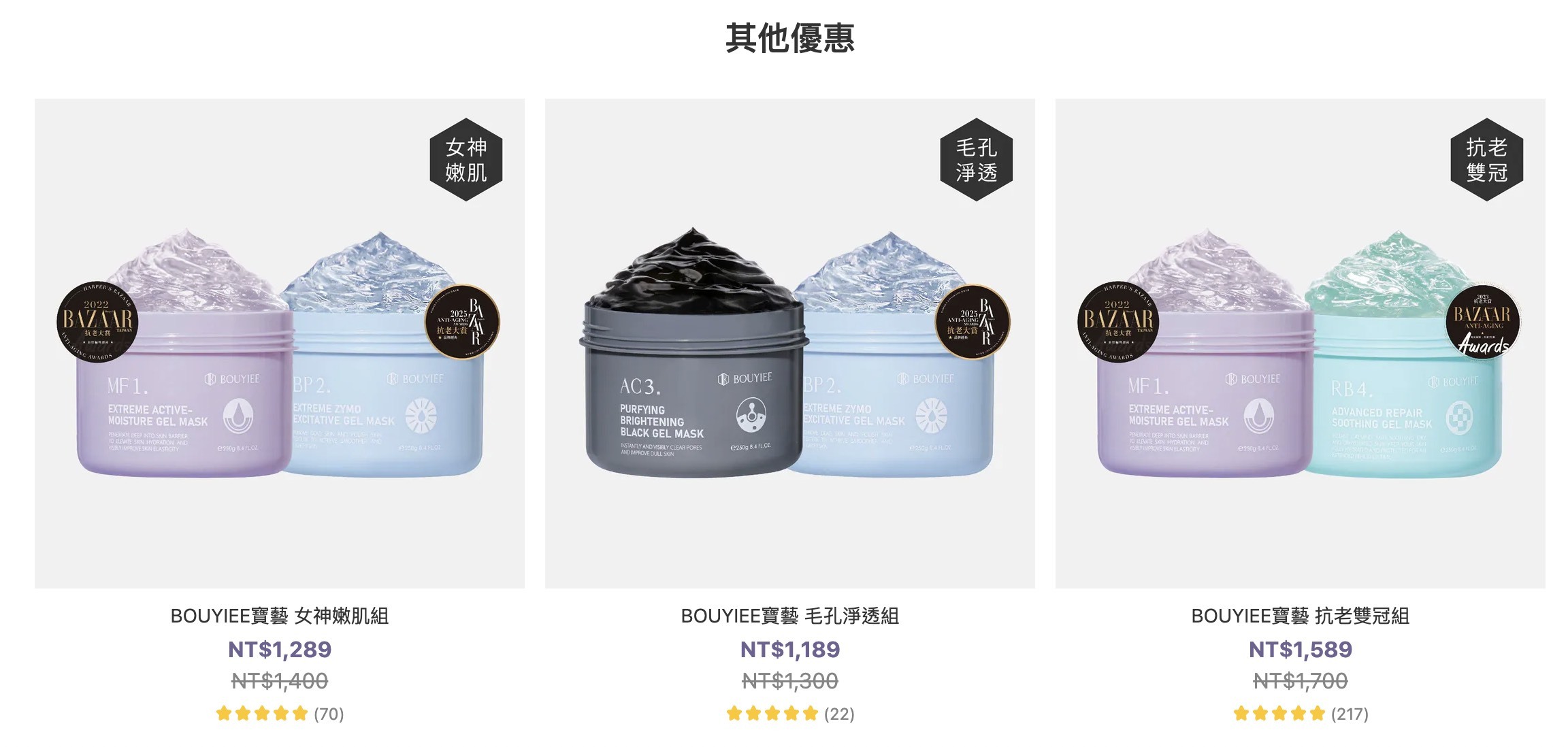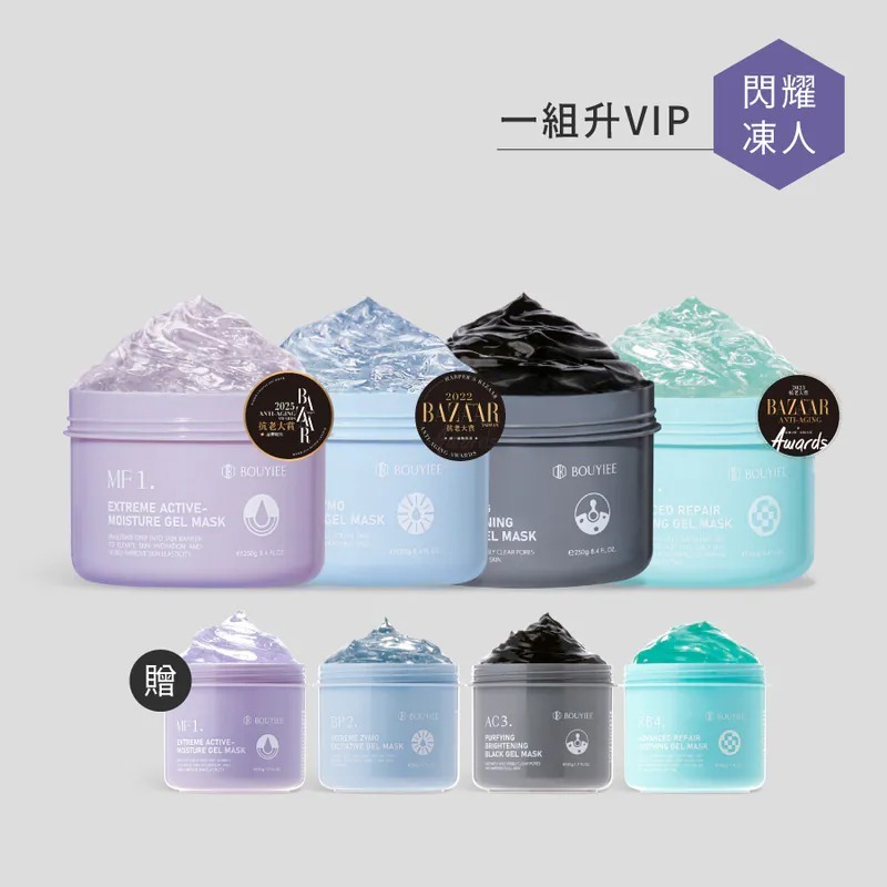 其中MF1保濕凍膜、BP2淨亮凍膜、RB4舒敏凍膜更有榮獲國際知名美妝雜誌BAZAAR抗老大賞NO.1,更是寶藝熱銷的三冠王👑