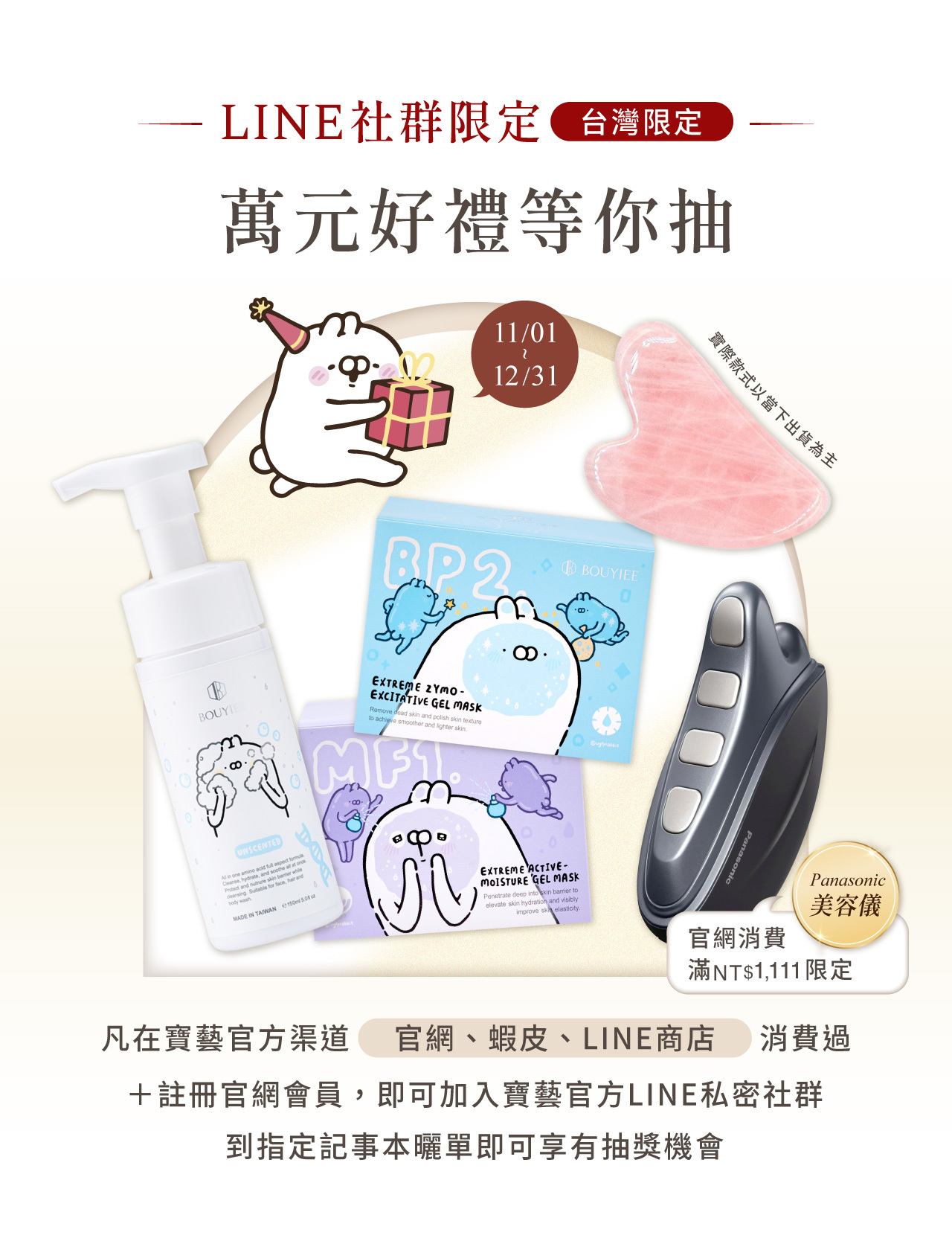 寶藝有一個官方LINE私密社群,只要有在官方渠道(官網/蝦皮/LINE商店)消費過+有註冊官網會員都可以加入,到記事本曬單號還能再抽美容刮痧板、寶藝單品任選一件,甚至有雙11加碼的「Panasonic國際牌美容儀」!價值NT$15,000!單筆消費滿NT$1,111就可以有一次抽獎機會。