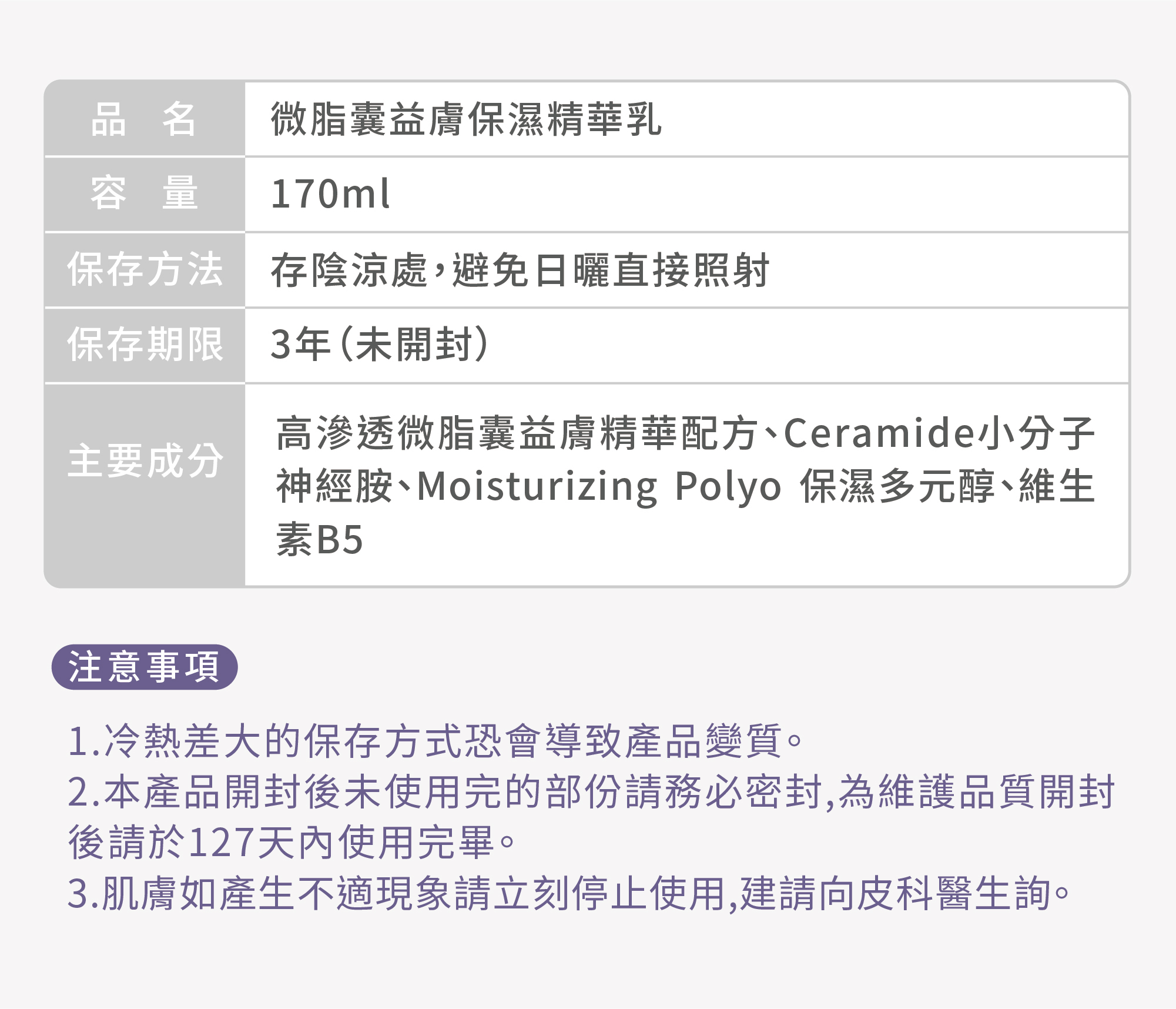 • 高滲透微脂囊技術包覆技術,24HR長效保濕修護