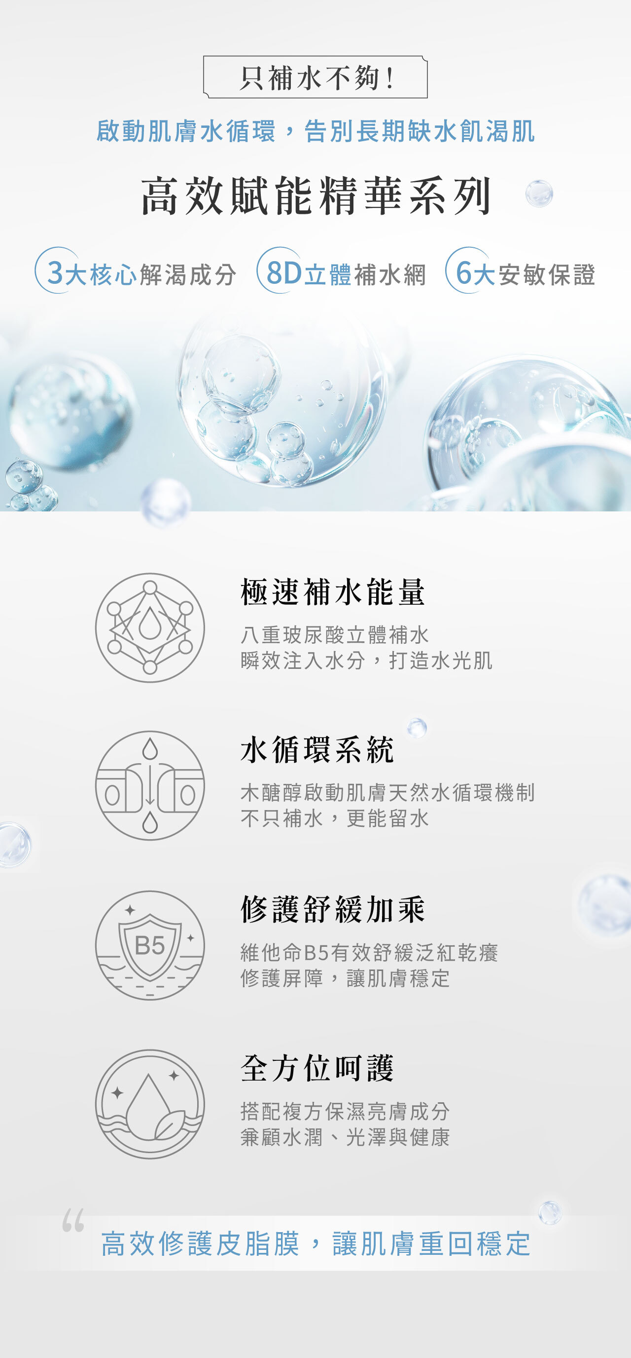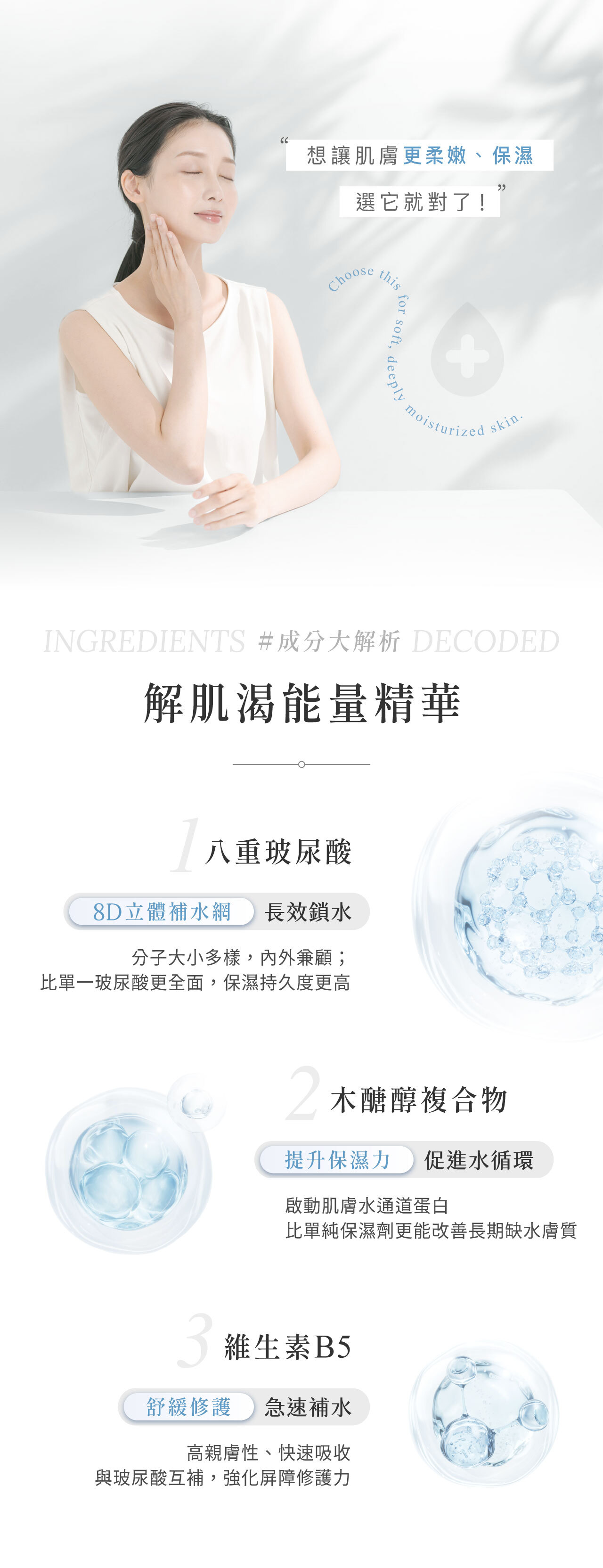 • 八重玻尿酸,秒速注入水潤能量,直達肌底,立即解渴