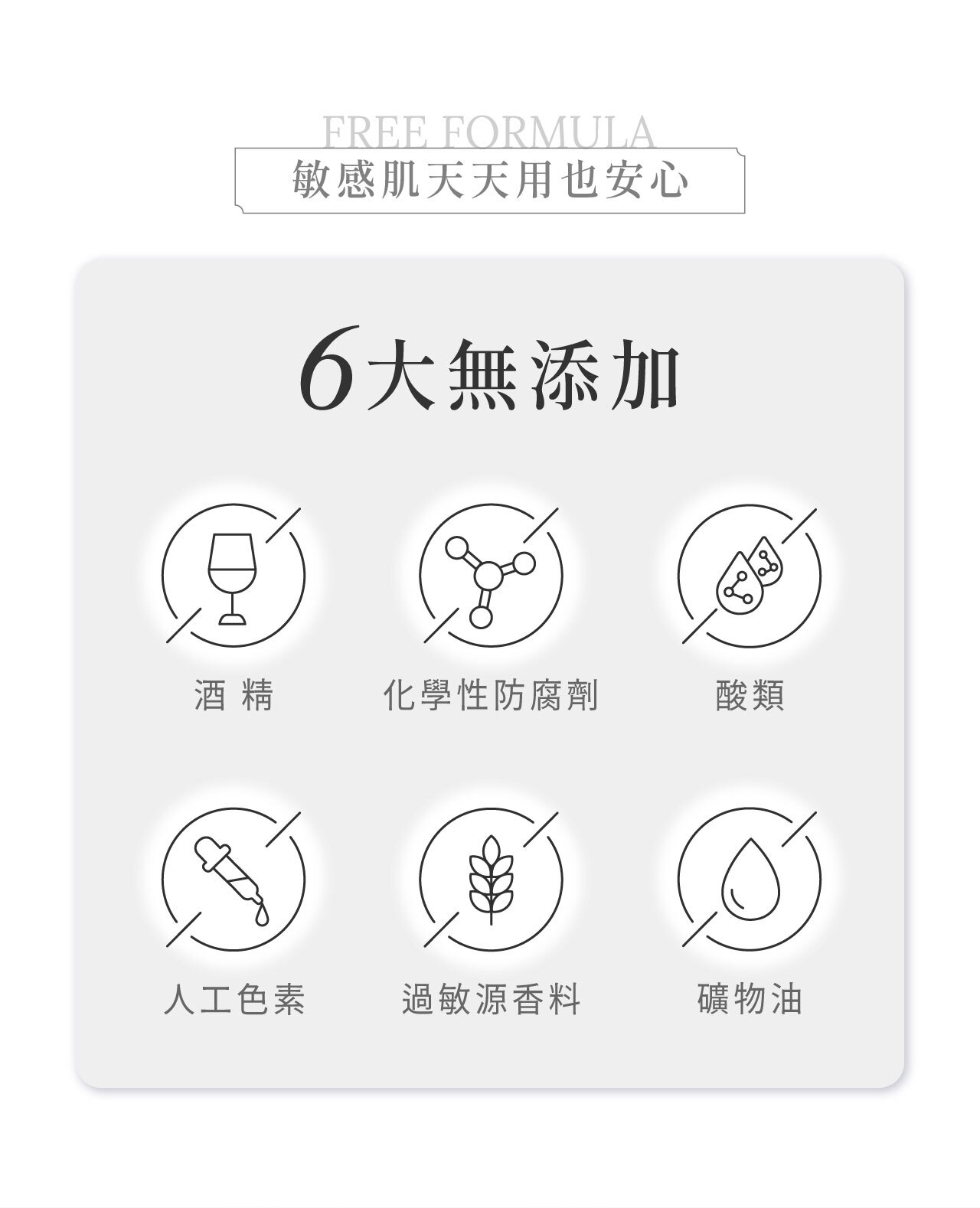 • 0% 酒精、化學性防腐劑、酸類、過敏源香料、色素、礦物油