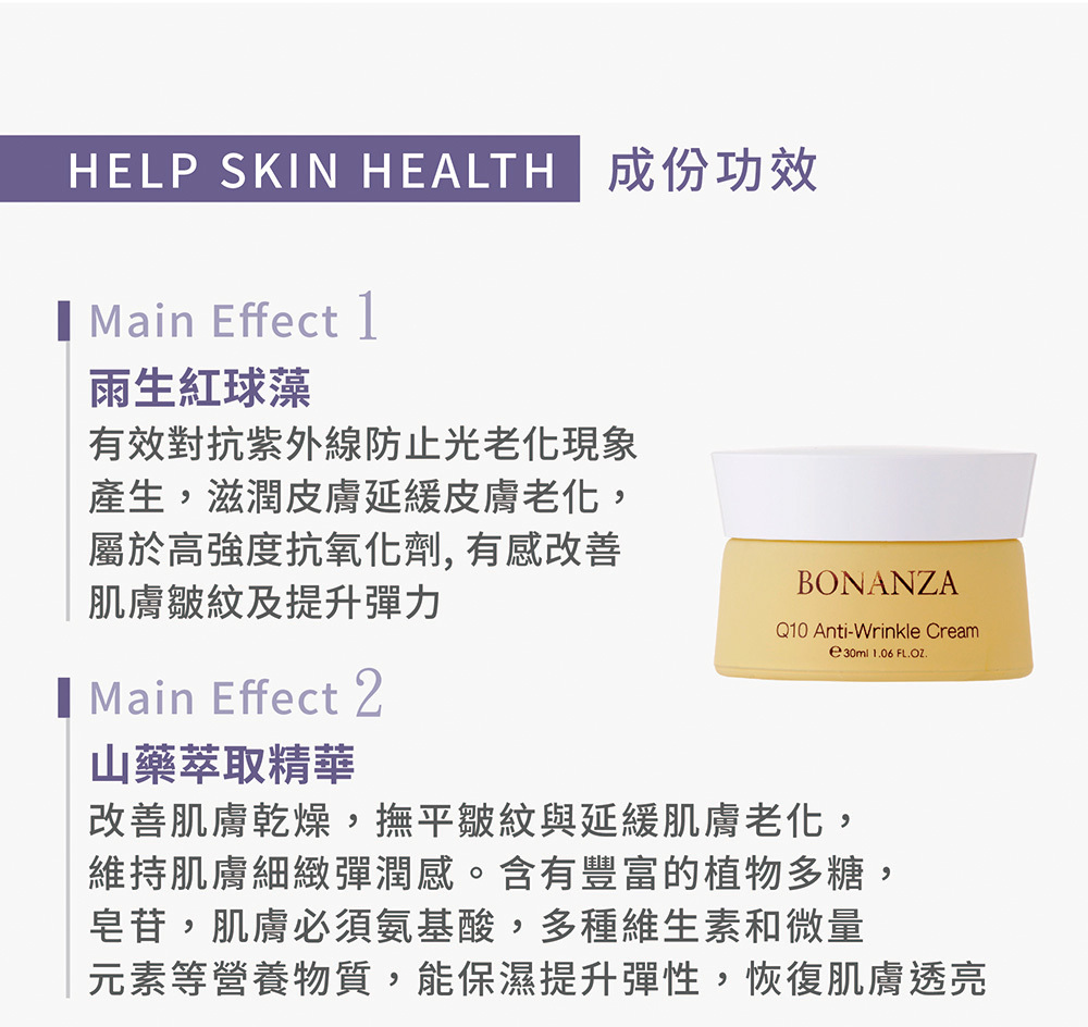 ★專為預防肌膚老化所研發的高滋潤Q10展延修護霜,添加天然萃取雨生紅球藻成分