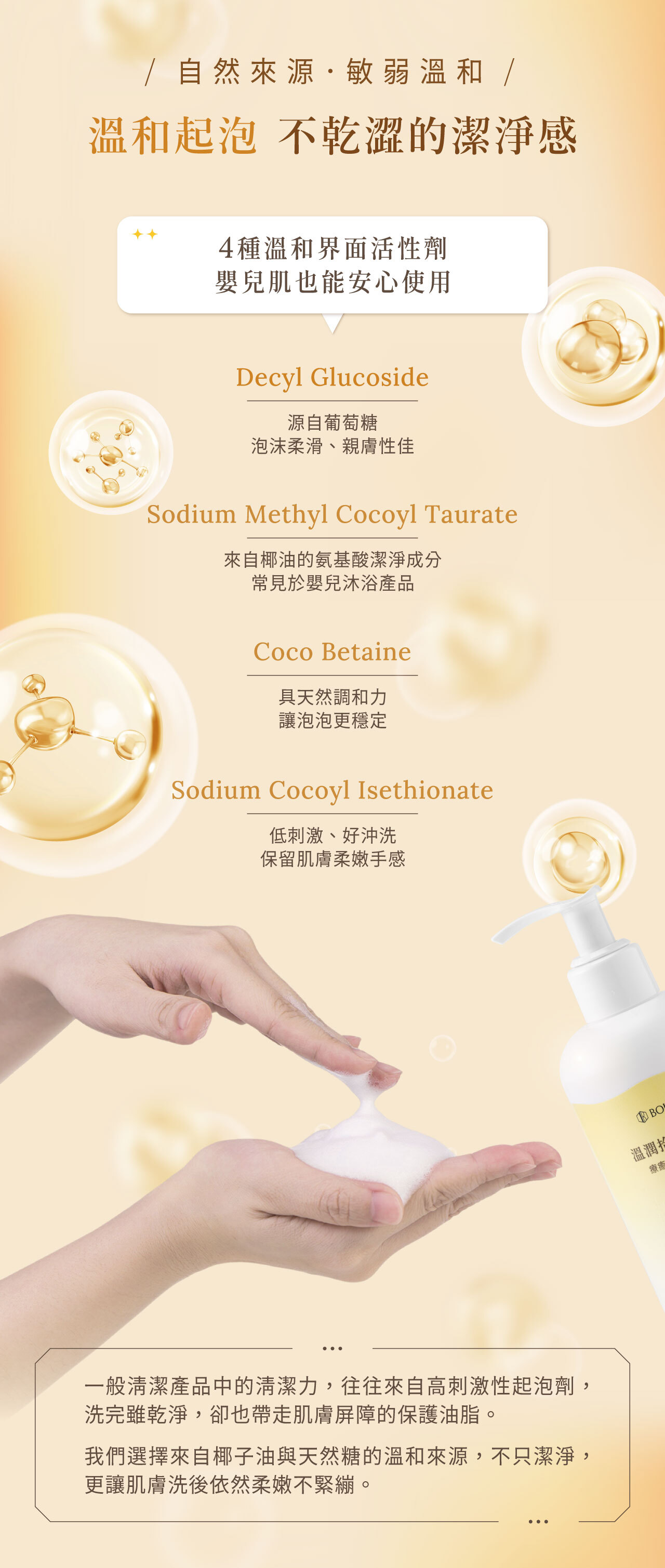 • 溫和起泡配方,自然來源界面活性劑