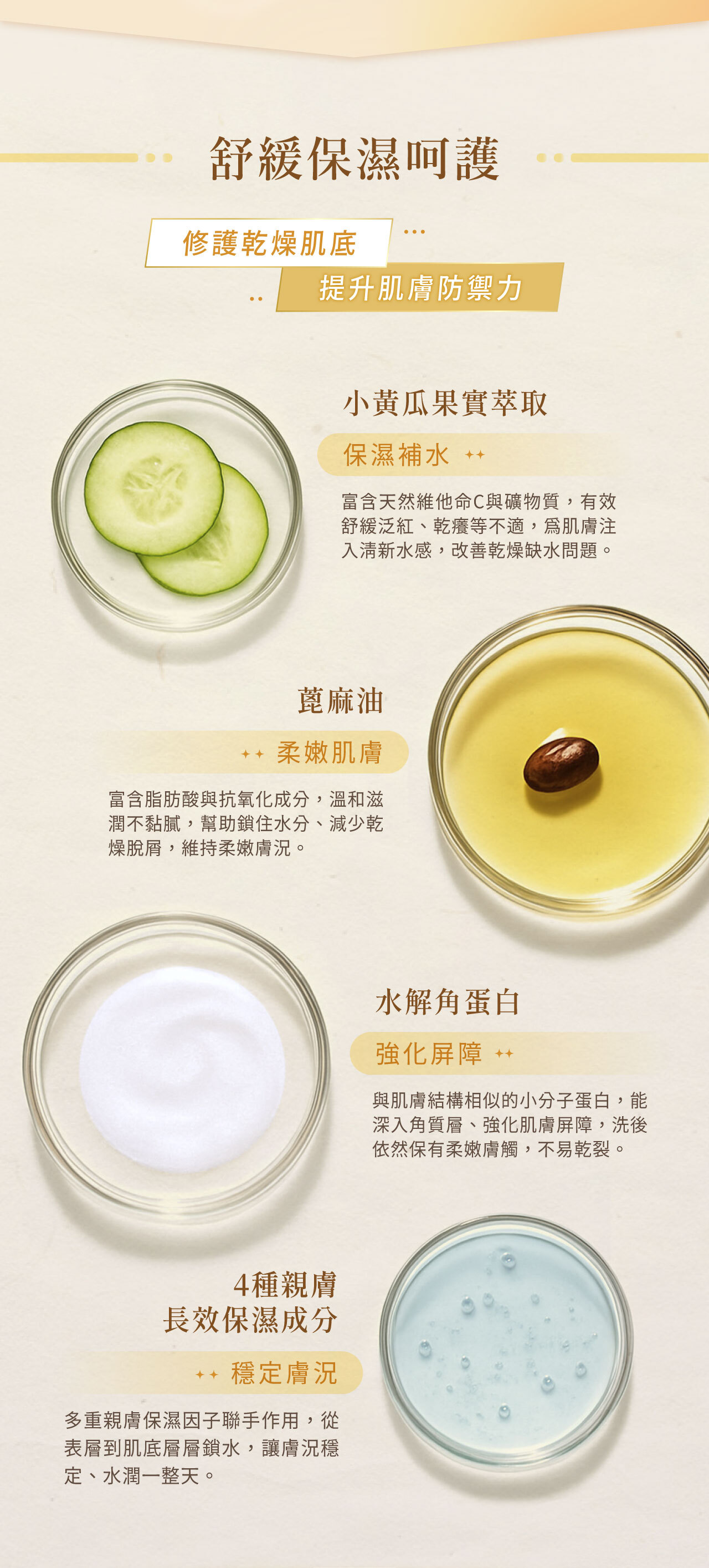 • 小黃瓜萃取+水解角蛋白,舒緩乾燥、強化肌膚屏障