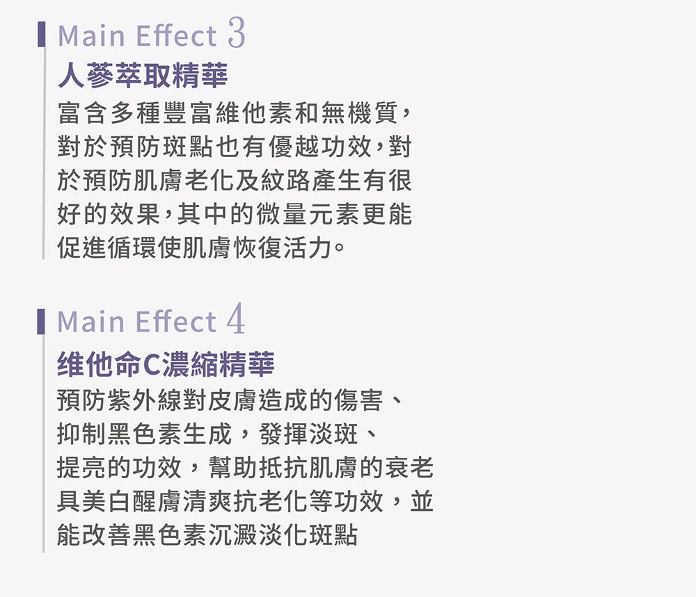 阻絕黑斑 淨白無死角 針對惱人超齡斑點、曬斑、黑色素沉澱造成黯沉肌膚問題 加入珍貴苦蔘、熊果葉植萃精華,不必再為肌膚暗沉、斑點而煩惱。