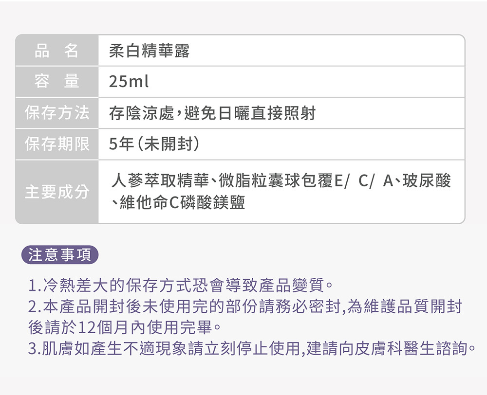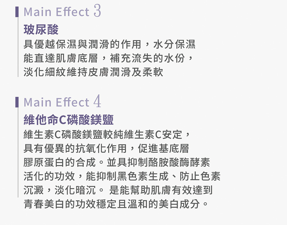 ★7% 熊果苷 + 3%維他命C 磷酸鎂鹽 *貼心提醒:內含左型維他命C,接觸陽光易產生反黑現象,建議夜間保養使用。